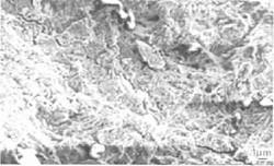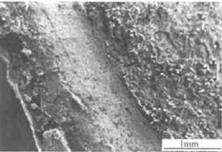 采用日本產(chǎn)的JSM-6300型掃描電子顯微鏡對(duì)斷口微觀特征進(jìn)行分析(以下電鏡照片左下角為外壁方向,右上角為徑向,即裂紋擴(kuò)展方向)。如圖3所示,整個(gè)斷面較為平整,但在斷裂邊緣處有一近似45b的斜斷面,寬約1mm,從圖中可看到新舊斷口全貌,中部舊裂紋是在使用過程中由于低周疲勞所形成的,右邊新斷口是瞬斷而形成的。